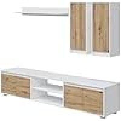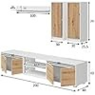 • Pared equipada - sala de estar, sala de estar multipropósito, composición para la sala de estar moderna, 200x40h14 cm, blanco y roble